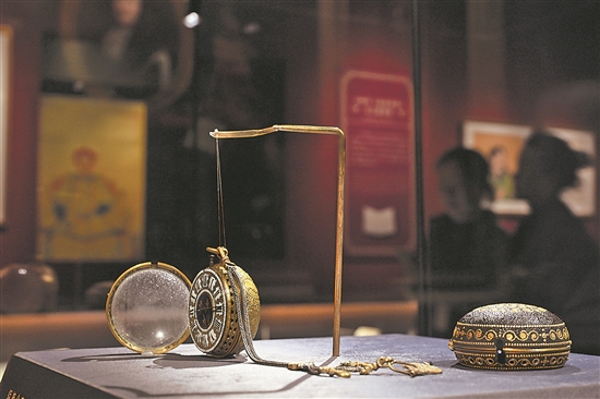 這是展出的故宮博物院藏銅鍍金殼開光人物像懷表。4月1日,作為中法文化旅游年的重要項(xiàng)目,“紫禁城與凡爾賽宮——17、18世紀(jì)的中法交往”展覽開幕式在北京故宮文華殿舉行,展出大約200件文物精品。新華社記者 金良快 攝