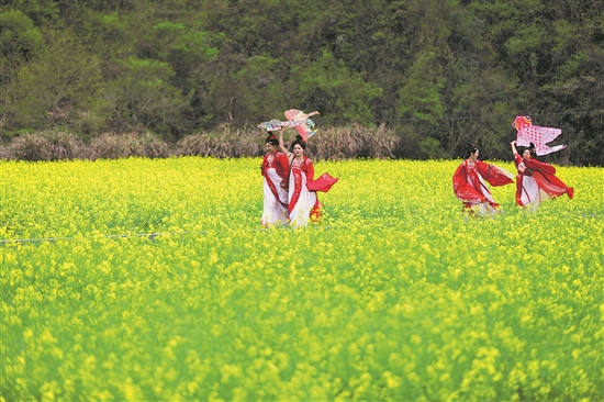 3月31日,在安徽省黃山市休寧縣齊云山鎮(zhèn)南坑村,游客在油菜花田游玩。