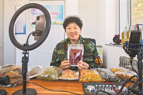 圖為何喜艷在阿木爾林業(yè)局龍河林場(chǎng)龍河管護(hù)站內(nèi)展示當(dāng)?shù)靥禺a(chǎn)。曾依托伐木養(yǎng)家糊口的何喜艷,停伐后在阿木爾林業(yè)局龍河林場(chǎng)龍河管護(hù)站工作。