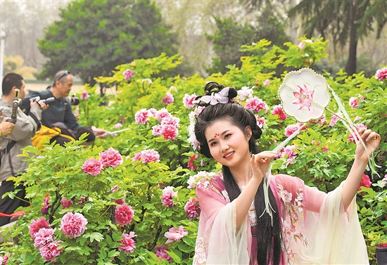 近日,洛陽(yáng)市各個(gè)牡丹觀賞園的牡丹花次第綻放,吸引眾多游客前來(lái)賞花游玩。