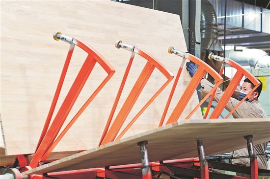 3月29日,在日照京杭林產(chǎn)家具有限公司,工作人員在生產(chǎn)設(shè)備前忙碌。