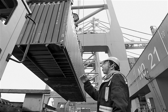 4月2日,在浙江省寧波市舟山港梅山港區(qū),地面工作人員協(xié)助指揮貨物裝卸。今年以來,寧波舟山港生產(chǎn)作業(yè)持續(xù)繁忙。1至2月,完成貨物吞吐量2.27億噸,同比增長(zhǎng)4.9%;完成集裝箱吞吐量612萬(wàn)標(biāo)準(zhǔn)箱,同比增長(zhǎng)15.3%。
