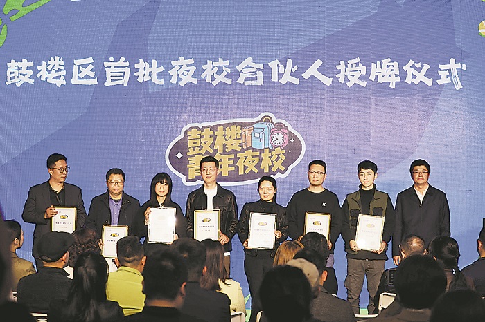 3月29日,南京鼓樓區(qū)首批夜校合伙人授牌儀式舉行,石遠(yuǎn)宇(右二)上臺接受授牌。