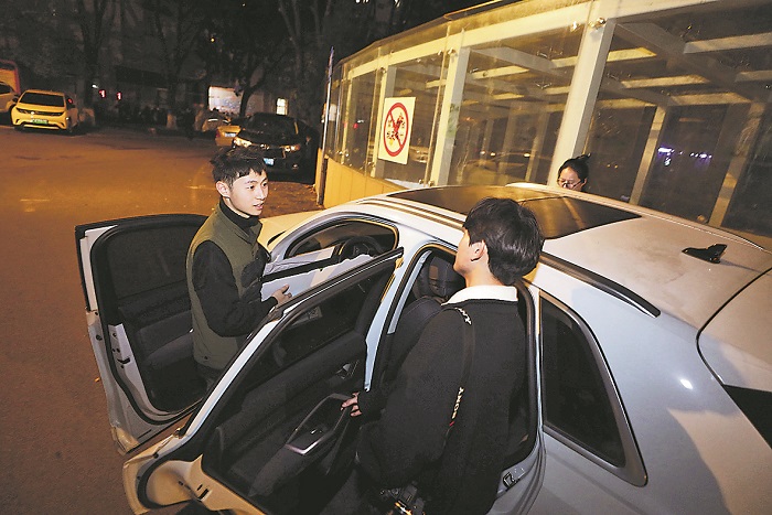 3月28日晚,南京市鼓樓區(qū)華陽佳園社區(qū)黨群服務(wù)中心,石遠(yuǎn)宇(左一)和老師們下課后一起回家。