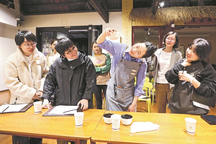 3月31日晚,在南京市玄武區(qū)小紅梅信仰生活空間,“辛苦咖”夜校專場活動(dòng)正在進(jìn)行。班主任小辛(右三)帶領(lǐng)大家“喝門道”,對咖啡風(fēng)味進(jìn)行品飲、識別和探索。