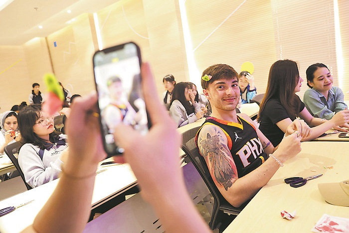 3月30日晚,在南京市鼓樓區(qū)的一堂非遺絨花課上,一位來自波蘭的留學(xué)生將自己做的絨花簪子戴在頭上。