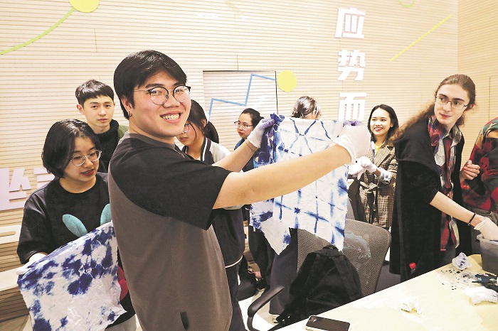 3月29日晚,在南京市鼓樓區(qū)的一堂扎染課上,一位來自越南的南京大學(xué)留學(xué)生展示自己的扎染作品。
