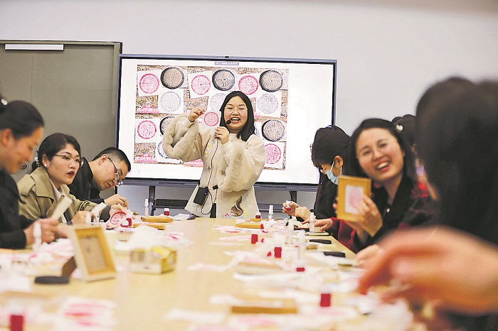 3月28日晚,南京江北新區(qū)綠水灣社區(qū)非遺拓印課程。