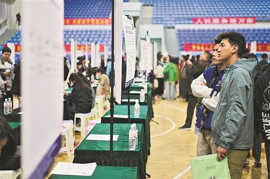 4月9日,學(xué)生在校園招聘會查看企業(yè)招聘需求。