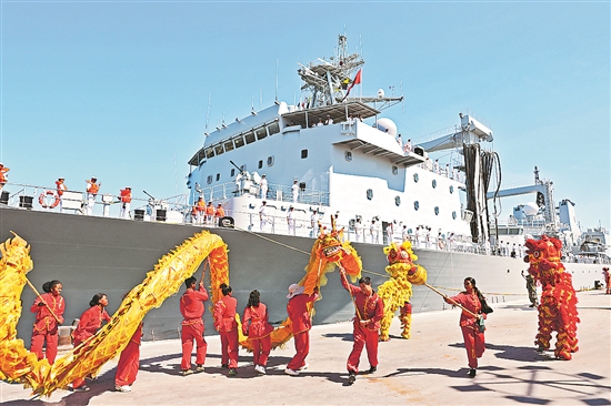 中國海軍第45批護航編隊日前抵達(dá)馬達(dá)加斯加圖阿馬西納港,開始為期5天的友好訪問。圖為中國海軍第45批護航編隊抵達(dá)圖阿馬西納港,歡迎儀式上馬方組織舞龍、舞獅表演。
