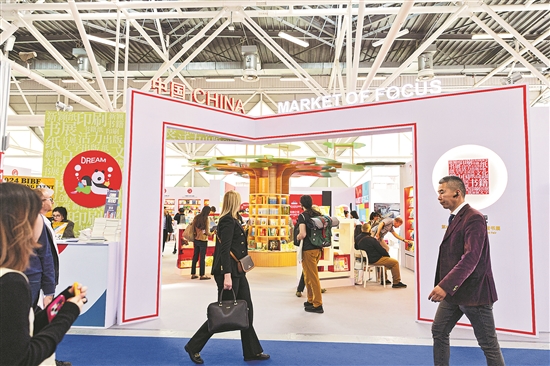 第61屆博洛尼亞國際兒童書展日前在意大利博洛尼亞會展中心開幕。中國是本屆書展唯一的“市場焦點國家”,展位空間增大、參展商增多,并將在參展期間舉辦中國市場焦點活動。圖為近日人們在意大利博洛尼亞國際童書展中國圖書展區(qū)參觀。