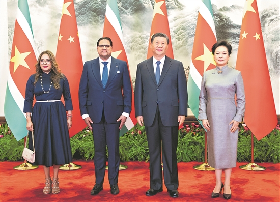 習(xí)近平指出,中蘇友誼源遠(yuǎn)流長、歷久彌堅。蘇里南是第一批同新中國建交、同中國建立戰(zhàn)略伙伴關(guān)系以及同中國簽署共建“一帶一路”合作規(guī)劃的加勒比國家之一。兩國始終相互尊重、平等相待,成為南南合作的典范。中方愿同蘇方一道努力,進(jìn)一步鞏固政治互信,加強經(jīng)貿(mào)合作,擴(kuò)大人文交流,密切國際協(xié)作,推動構(gòu)建更加緊密的中蘇戰(zhàn)略合作伙伴關(guān)系,更好造福兩國人民。