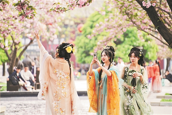 近年來(lái),在古都西安,身著傳統(tǒng)服飾出行成為一種時(shí)尚,受到越來(lái)越多年輕人的追捧。 新華社記者 邵瑞 攝