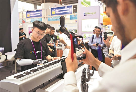 4月17日,佩戴智能仿生手的參展商工作人員在強(qiáng)腦科技展臺(tái)演奏電子琴。