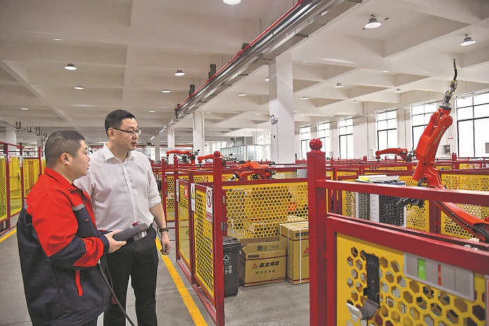 4月16日,安徽宣城市安徽云華智能裝備有限公司,“科技副總”、合肥工業(yè)大學(xué)宣城校區(qū)機(jī)械教工黨支部書記劉勇(圖右)正在了解機(jī)械臂生產(chǎn)情況。