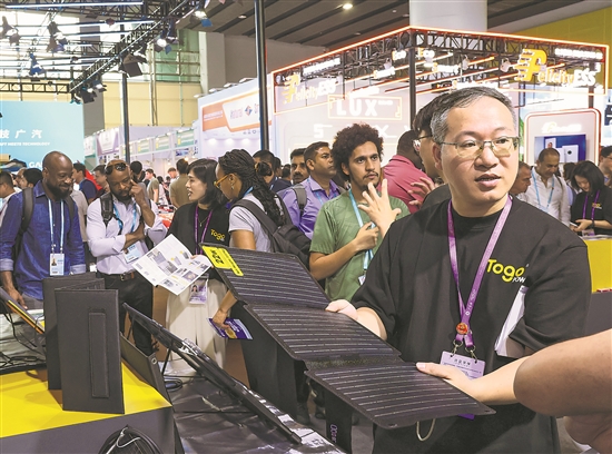 4月15日,參展商在第135屆廣交會上向采購商展示便攜式折疊太陽能電池組件展品。
