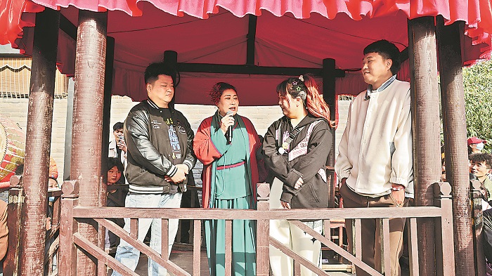 記者了解到,起初這檔節(jié)目只是“王婆”帶著另一位女演員在臺(tái)上與游客簡(jiǎn)單互動(dòng),時(shí)長約10分鐘。后來景區(qū)與導(dǎo)演團(tuán)隊(duì)希望能讓游客體驗(yàn)到古代的市井文化,趙梅便抱著試一試的態(tài)度,以現(xiàn)場(chǎng)說媒的形式與游客互動(dòng)。