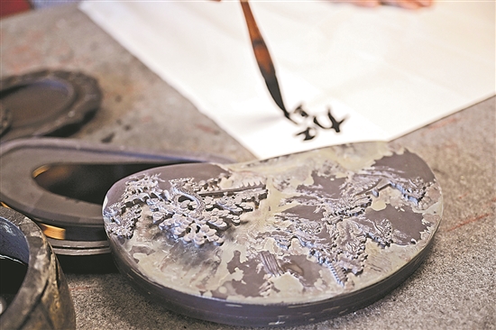 閆森林介紹說,賀蘭石褐紫、豆綠兩色相互掩映,常伴有玉帶、云紋、眉子、石眼、銀線等天然紋樣陪襯。一方賀蘭硯,要經(jīng)歷相石選料、設(shè)計(jì)、打硯坯、初步雕刻、精細(xì)雕刻、打磨、上光等工序,才會出現(xiàn)在使用者的眼前。制作時(shí)要因石制硯、順其自然、發(fā)掘內(nèi)涵,依據(jù)石頭的形狀、色彩,加以設(shè)計(jì)和雕刻。