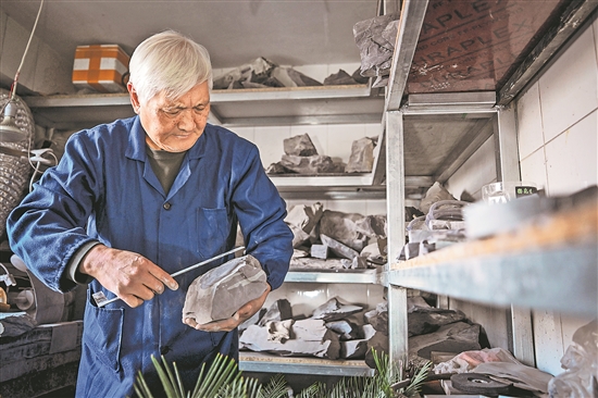 步入銀川文化城,古色古香的建筑下,一位滿頭銀發(fā)的老人在陽光下“叮叮當(dāng)當(dāng)”,對著一塊賀蘭石精雕細(xì)琢——他就是鉆研賀蘭硯雕刻技藝50多年的國家級非遺傳承人閆森林。