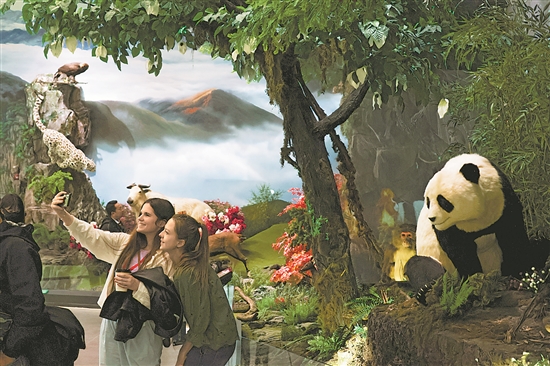 4月22日,參觀者在四川省雅安市寶興縣大熊貓國(guó)際文化交流中心內(nèi)拍照。當(dāng)日,寶興縣大熊貓國(guó)際文化交流中心開(kāi)館。新華社記者 胥冰潔 攝