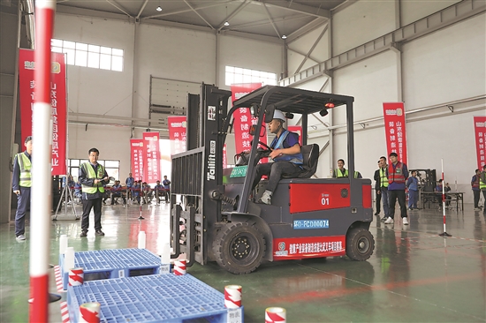4月21日,山東健康集團(tuán)工會(huì)開展健康產(chǎn)業(yè)裝備制造技能比武,71名叉車高手同臺(tái)競技。圖為一名參賽選手正駕駛叉車進(jìn)行技能比武。此次技能比武旨在以賽促練、以練促學(xué)、以學(xué)促干,調(diào)動(dòng)激發(fā)職工學(xué)習(xí)技能、鉆研技術(shù)、創(chuàng)新創(chuàng)造的熱情。本報(bào)記者 田國壘 本報(bào)通訊員 竇錦凱 攝