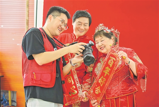 4月24日,福建省福州市鼓樓區(qū)安泰街道烏山社區(qū)的工會驛站里,一對退休老年夫妻正在觀看相機里的古裝合照。當日,共有25對退休職工在工會驛站接受了志愿者為他們免費拍攝婚紗照,迎接“五一”國際勞動節(jié)的到來。