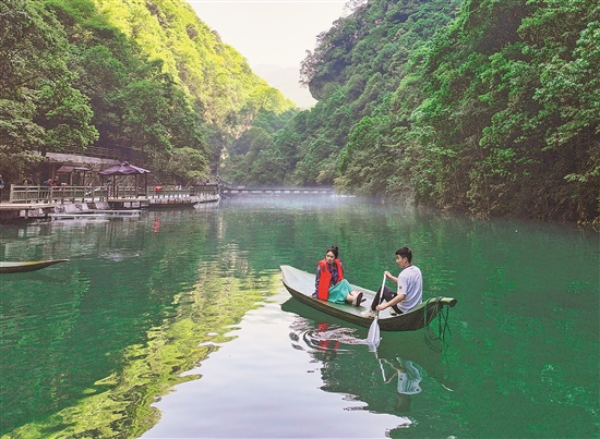 屏山旅游景區(qū)以水質清澈聞名?!拔逡弧奔倨谂R近,屏山景區(qū)推出仿生“箬葉”船等新型游船,帶給游人漂浮于碧波之上的游覽體驗。