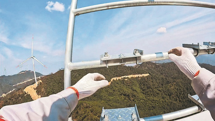 國投集團雅礱江公司臘巴山風電項目,陳超杰正在進行風機運維作業(yè),他的腳下樹林郁郁蔥蔥,一臺臺風機整齊地矗立。
