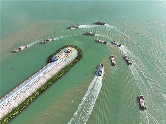 4月29日,在江蘇省連云港市連島中心漁港碼頭,漁船紛紛返港準備休漁(無人機照片)。
