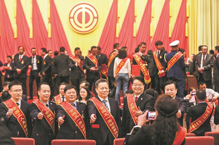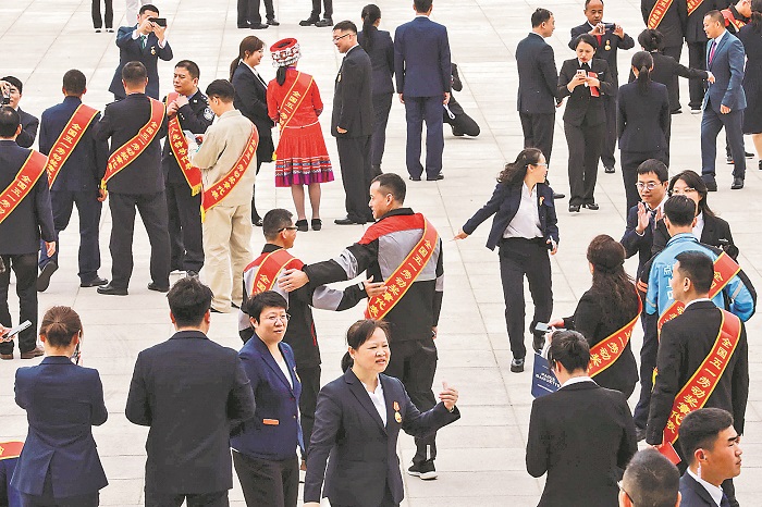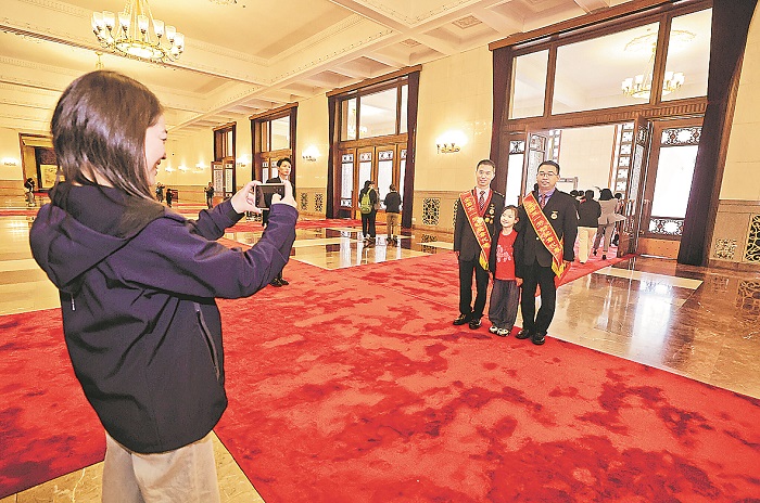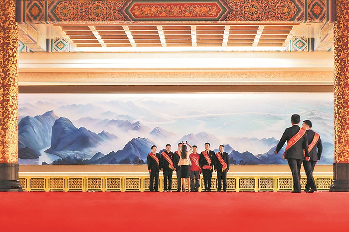 表彰大會開始前,獲獎代表們在北京人民大會堂里的《長江萬里圖》前合影。