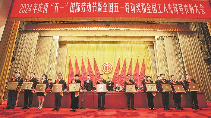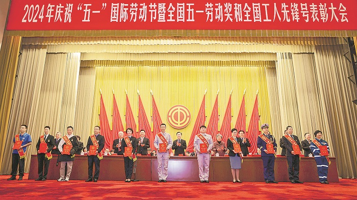 全國五一勞動獎?wù)芦@得者代表上臺領(lǐng)獎。