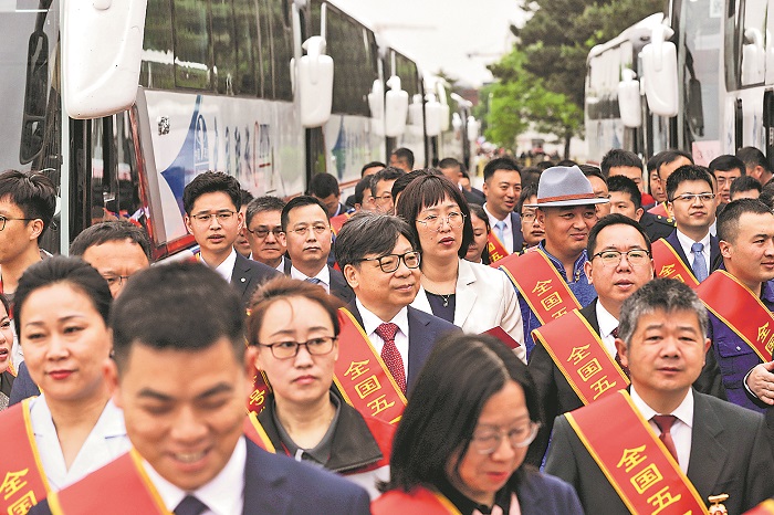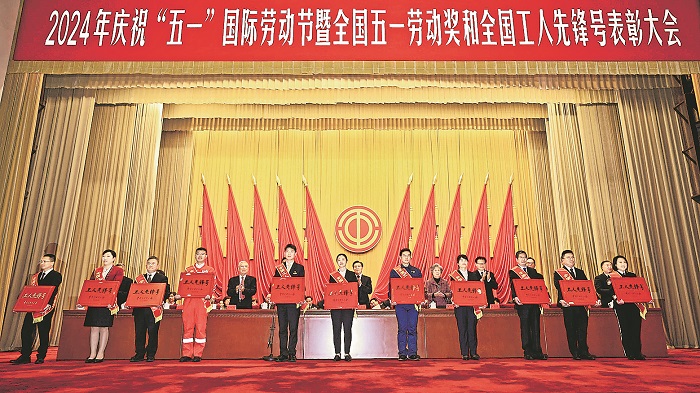 全國五一勞動獎狀獲獎單位代表上臺領(lǐng)獎。
