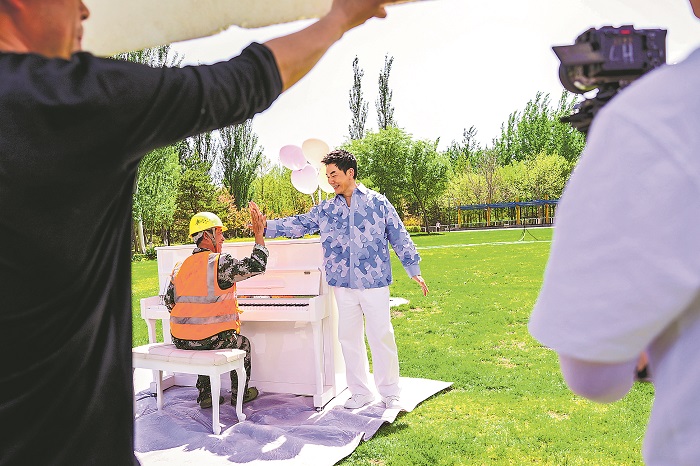 4月18日,央視總臺在中關(guān)村軟件園內(nèi)的一處草坪上錄制2024年“中國夢·勞動美”慶?!拔逡弧眹H勞動節(jié)心連心特別節(jié)目,來自深圳的建筑工人易群林應(yīng)邀與知名歌手任賢齊搭檔演出。