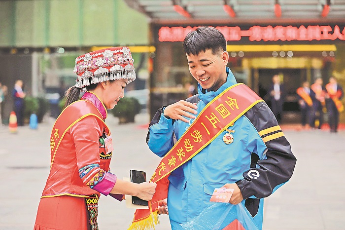 中國職工之家門口,今年的全國五一勞動獎?wù)芦@得者粟瓊(圖左)幫助另一位獲獎?wù)吆槌赡菊砭R帶。