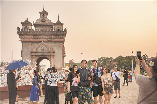 近日,中國游客在老撾首都萬象著名地標(biāo)景點(diǎn)凱旋門前拍照。“五一”假期,許多中國游客搭乘中老鐵路國際旅客列車赴老旅游,領(lǐng)略老撾歷史文化。新華社發(fā) (凱喬 攝)