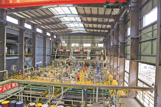 圖為氧壓工段一班工人在氧壓浸出生產(chǎn)車間巡檢。