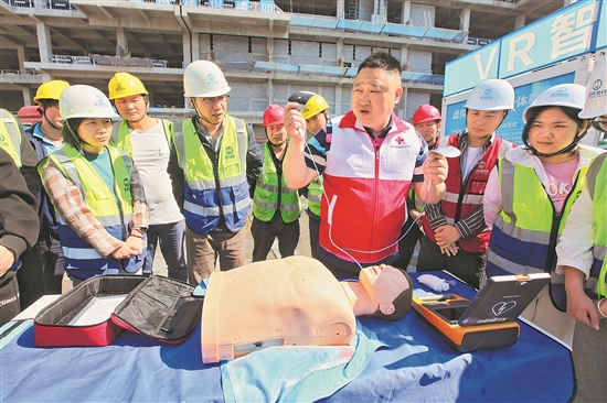 5月8日,江蘇省徐州市鼓樓區(qū)一建筑工地,急救培訓(xùn)教員向工人講解自動體外除擅儀使用方法。