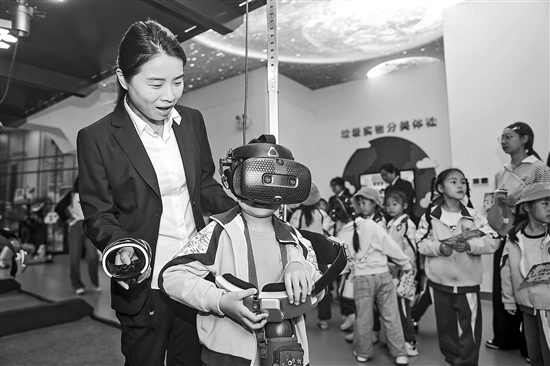 近日,在浙江省湖州市南潯區(qū)人民法院道德法治教育實踐基地,小學(xué)生們正在通過VR眼鏡進(jìn)入虛擬法治展館,通過交互技術(shù)了解法律條文,身臨其境地體驗沉浸式的普法教育。陸志鵬 攝/中新社