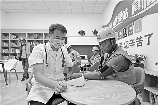 5月9日,醫(yī)務(wù)人員在雄安新區(qū)大河片區(qū)一處暖心驛站內(nèi)為建設(shè)者測量血壓。