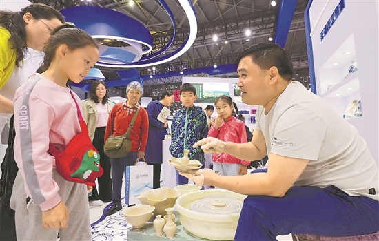 5月12日,江西景德鎮(zhèn)展臺(tái)的工作人員(右)向參觀者介紹瓷器制作的步驟。 在上海舉辦的中國品牌博覽會(huì)地方展區(qū),成為全國各地優(yōu)質(zhì)品牌的“大舞臺(tái)”,結(jié)合各地產(chǎn)業(yè)發(fā)展和區(qū)域特色的產(chǎn)品及文化在這里精彩呈現(xiàn),為中國品牌日活動(dòng)增光添彩。