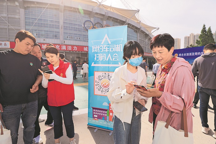 5月12日,安徽省淮北市舉辦貨車司機(jī)、網(wǎng)約車司機(jī)集中入會(huì)儀式,100余名貨車司機(jī)、網(wǎng)約車司機(jī)現(xiàn)場(chǎng)掃碼加入工會(huì)組織,接受法律幫扶、愛(ài)心禮包和互助保障贈(zèng)送等關(guān)愛(ài)服務(wù)。