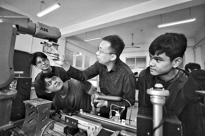 5月10日,在山東萊蕪職業(yè)技術(shù)學(xué)院智能制造系的自動(dòng)化教室,全國(guó)青年崗位能手、齊魯首席技師賈川(右二)老師正耐心指導(dǎo)來(lái)自泰國(guó)的留學(xué)生規(guī)范操作工業(yè)機(jī)器人。隨著共建“一帶一路”倡議的深入實(shí)施,越來(lái)越多“走出去”企業(yè)迫切需要大量?jī)?yōu)秀人才。