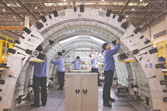 在航空工業(yè)沈飛民機車間,工作人員進行機身半殼鉚接作業(yè)(4月25日攝)。