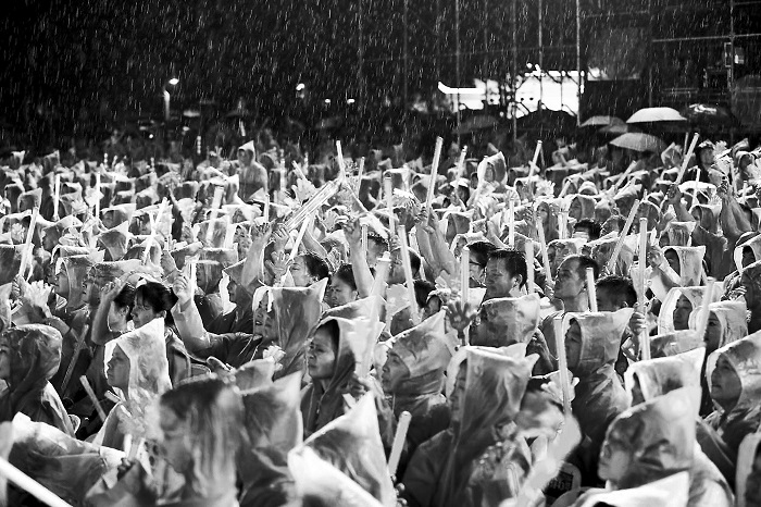 第十一屆湖北省黃梅戲藝術(shù)節(jié),市民在雨中看戲。程吉楊 攝
