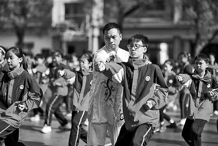 雷超(中)在黃梅縣第一小學(xué)教授岳家拳。石勛 攝