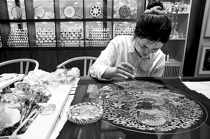 “之前在互聯(lián)網(wǎng)工作,我就想了一個(gè)‘黃梅+’的模式”,就是將黃梅挑花和現(xiàn)代元素結(jié)合,比如將挑花作為裝飾做成墻面、燈罩、匾額等等。不久前就有顧客找到她,定制挑花的窗簾?!坝悬c(diǎn)像‘高定’了”,她戲言。