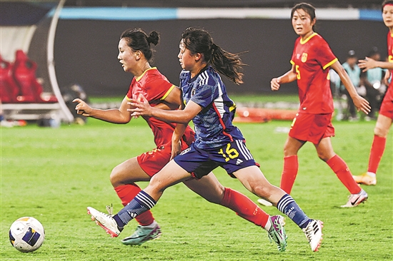 近日,在印度尼西亞巴厘島進(jìn)行的2024年U17女足亞洲杯B組最后一輪比賽中,中國(guó)隊(duì)0比4不敵日本隊(duì),以小組第二名進(jìn)入淘汰賽。圖為中國(guó)隊(duì)球員董宇杰(左)在比賽中帶球突破。新華社發(fā)(阿貢 攝)