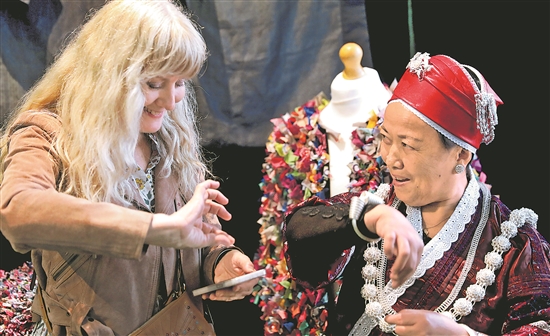 近日,在英國倫敦手工藝周“設(shè)計(jì)中國·和韻華夏”主題展上,英中貿(mào)易協(xié)會執(zhí)行董事莉絲·貝特爾森(左)向中國手工藝人學(xué)習(xí)苗繡手法。2024年倫敦手工藝周5月13日在倫敦拉開帷幕,數(shù)百場展覽、工作坊、論壇等活動遍布全城。來自中國的傳統(tǒng)技藝與創(chuàng)新工藝為活動增添了一抹亮色。新華社記者 李穎 攝