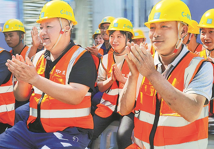 5月8日,來自公安、教育、交通等行業(yè)的6位勞模工匠齊聚山東省濟南市中雨污分流項目工地,為中建五局濟南公司建設(shè)者們帶來了一場生動精彩的事跡宣講會。圖為現(xiàn)場工友為勞模事跡鼓掌。