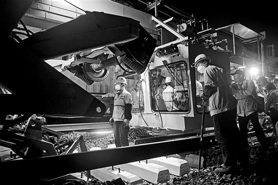 5月14日深夜,鐵路工人操縱大修列車對滬昆鐵路滬杭段進(jìn)行機械化大修換枕施工作業(yè)。夜色中,全長超過百米的大修列車猶如盤臥在鐵路上的“機械長龍”,鐵路工人操縱著大修列車對滬昆鐵路滬杭段施工范圍內(nèi)16670根老舊的軌枕進(jìn)行更換,確保鐵路運輸平穩(wěn),旅客出行安全。新華社記者 江漢 攝